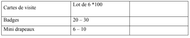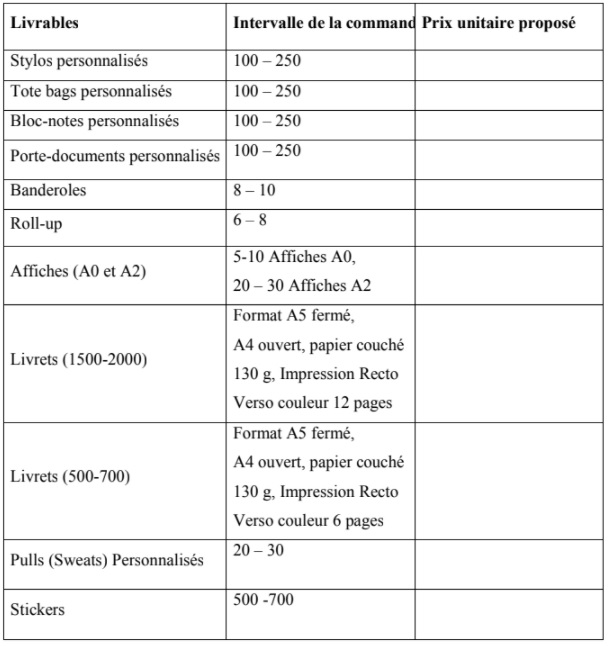 Une convention avec le prestataire sélectionné sera signée pour la durée du projet, cette convention mettra en évidence l’ensemble des termes et conditions de la prestation. La commande de ces articles s’effectuera à travers une demande au préalable selon le planning des activités de l’association.