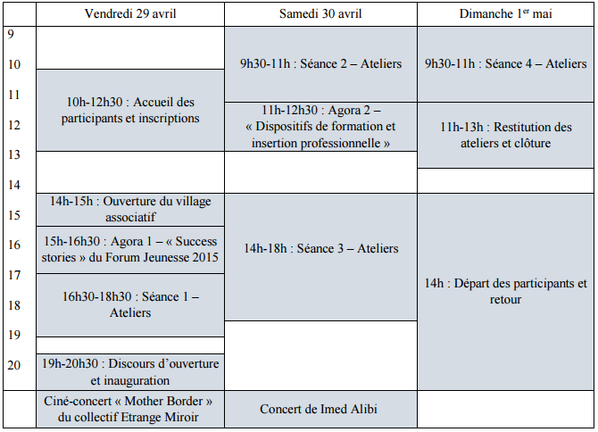 Après cinq éditions organisées entre Tunis et Monastir, le Forum Jeunesse se délocalise à Gafsa en 2016, afin d’impliquer au mieux la jeune société civile de l’intérieur de la Tunisie, les 29, 30 avril et 1 er mai.