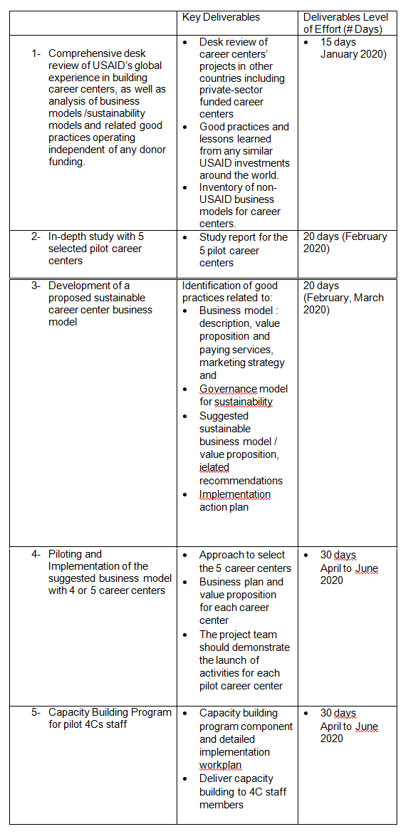 1°) Comprehensive desk review and analysis of global experience in building career centers, including models funded by the private sector as well as good practices and lessons learned from any similar USAID investments around the world that involved partial or full private sector funding.