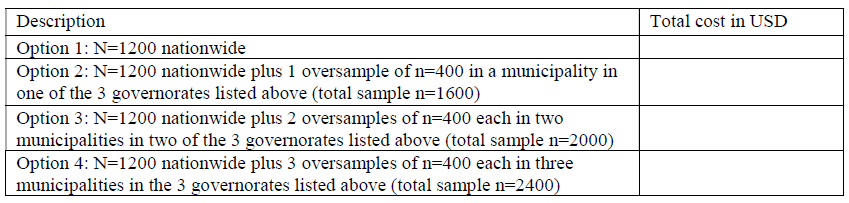- (3) Sample Design. IRI requires a national sample of 1,200 adults, age 18 or older, that is representative of the population of the survey universe, and potentially oversamples of n=400 each in up to three municipalities in the following regions Tunis 1, Monastir and Gafsa – details in the pricing table. Planned exclusions of the population of the survey universe (e.g. geographic etc.) must be discussed during quotation stage. The sample shall be drawn using recognized probability methods, all the way down to the selection of the individual respondent at the household level. In the event that any departure from probability sampling methods is recommended by the bidder for all or any part of the survey, the sampling methodologies to be employed shall be described in detail and a rationale for their use shall be provided. IRI’s general preferred sampling approach is: