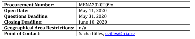 • IRI will provide drivers with 50 TND in phone credit per monthTechnical Bid: Interested bidders must present a technical bid not to exceed 5 pages (not including attachments and certifications) in Times New Roman, 12-point font, outlining the following information: