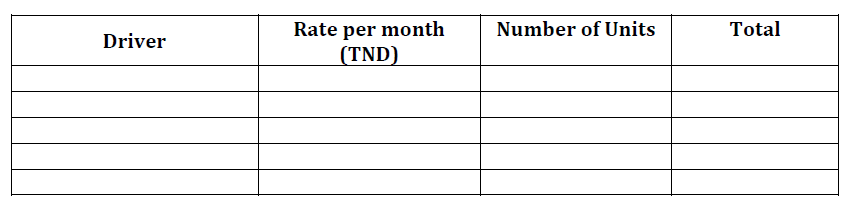 Price information should be presented as a firm-fixed Unit Price for each of the deliverables identified below and in the format of the table below. Pricing must be valid for at least 60 (sixty) calendar days after the due date for proposal submission. The proposed Unit Price should be fixed and inclusive of all costs to perform, including inspection services, transportation, taxes, import duties (if any), and other levies. If there are any additional fees not reflected in the table below, such pricing must be fully described in the bid. Bids must be submitted in TND; payments under any resulting contract will be made in this currency.