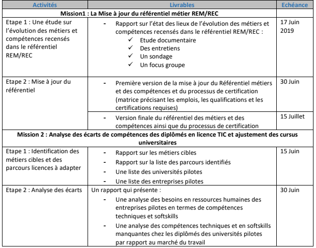 • Il est demandé de concevoir et d’appliquer une approche participative (Fédération du numérique, Entreprises Membres de la Fédération du numérique-Ministère de l’enseignement supérieur, Le ministère de la formation professionnelle et de l’emploi, le ministère des technologies de l’information et de l’économique numérique/smart Tunisia , (EFE) Tunisie, directeurs et enseignants des institutions universitaires, étudiants, Entreprises pilotes …) au