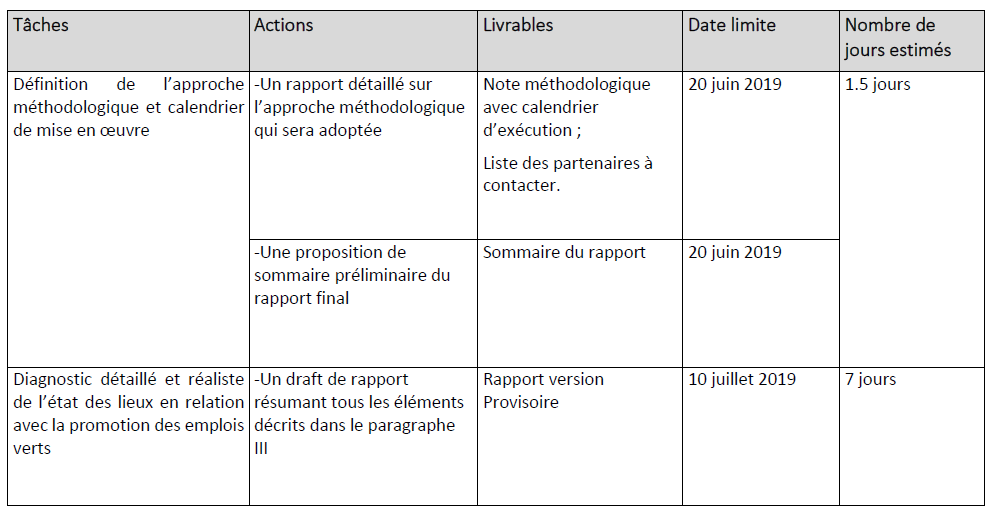 sur le terrain, 2 jours de rédaction du rapport, provisoire, 1 jour pour la finalisation du rapport final) sur une