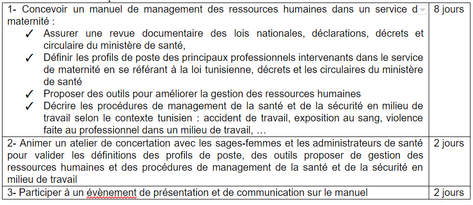 Le consultant travaille en collaboration étroite avec le coordinateur de projet MdM basé à Gafsa ainsi que le chargé de projet SIHATOUNA. Il aura pour mission de concevoir un manuel de gestion des ressources humaines et le valider par les sages-femmes de la région de Gafsa.
