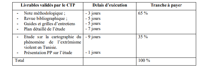 • Produire, avec le soutien du/de la consultant(e) d’appui, l’étude sur la cartographie du phénomène de l’extrémisme violent en Tunisie, et ce en poursuivant les tâches suivantes :
