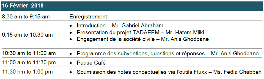 L’objectif de la session d’information, est de permettre à l’équipe TADAEEM d’introduire le projet ainsi que le programme de subventions aux OSC de Sfax.