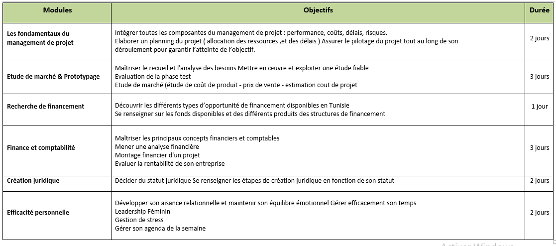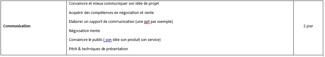 Les formations seront réparties en 8 modules séparés comme précisé dans le tableau suivant: