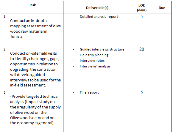 The consultant will contribute deep to the conceptualization and formalization to put a strategy of sustainably improving industry access to olive wood supply through public-private collaboration, through initiatives that will be prioritized and led by local value chain stakeholders. Tasks will include areas such as analysis and assessment and facilitation of technical meetings and workshops, as described in further detail below.