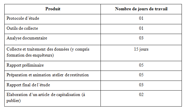 La mission s’étalera entre Juillet et Aout 2019 et nécessitera 40  jours de travail effectif.