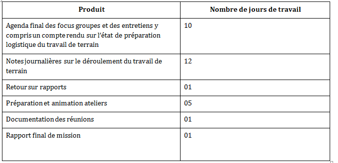 PRODUITS ATTENDUS ET AGENDA DE TRAVAIL