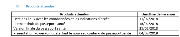 Le consultant devra livrer la version finale du passeport santé révisé selon les besoins des populations migrantes de Sfax, Médenine et Zarzis au plus tard le 25 février 2018.