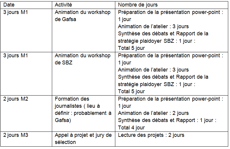 - Mener en cofacilitation avec le consultant en plaidoyer deux workshops avec la societé civile de 3 jours dont un à Gafsa et un à Sidi Bouzid pour la mise en place d’une stratégie de plaidoyer dans les 2 régions. Préparer une présentation sous format power-point qui s’inspire de l’Etude analytique de la politiques tunisienne en matière de santé périnatale basée sur une approche droits de l’homme. Présentation qui sera simplifiée pour une bonne appropriation par la sociéte civile et sera l’outil de base des workshops.