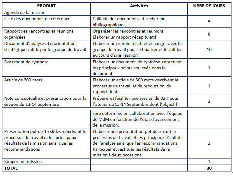 La consultation nécessitera 30 jours de travail effectif étalés sur une période de 04 mois à partir de la signature du contrat. Les honoraires journaliers seront alignés sur la grille des honoraires des consultants de MdM BE.