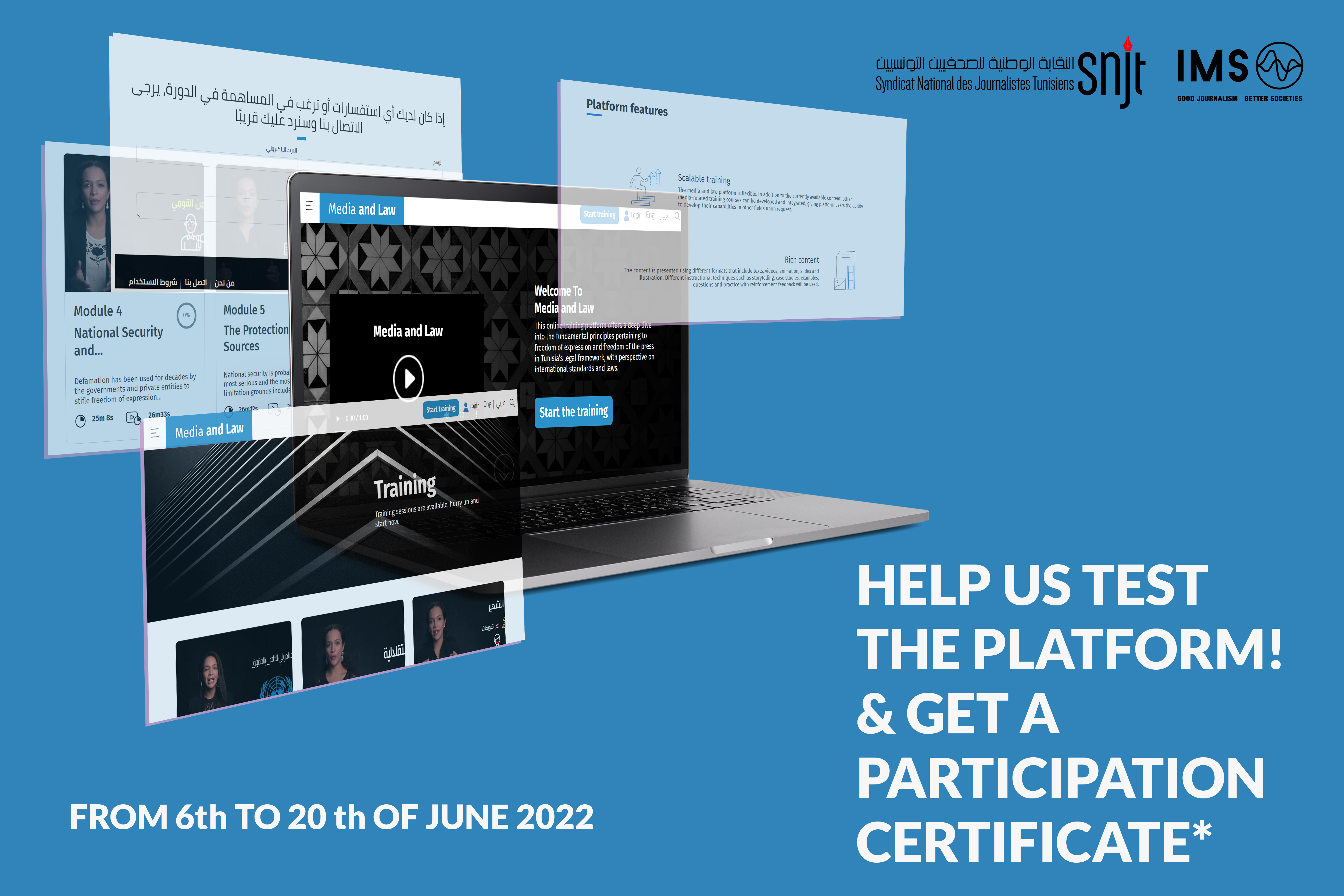 International Media Support (IMS) is planning to launch its new e-learning platform « Media and Law », in collaboration with the National Syndicate of Tunisian Journalists (SNJT),