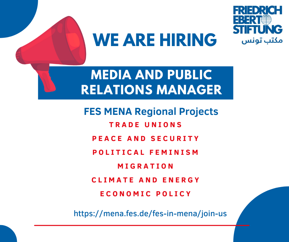 FES MENA est à la recherche d’un membre d’équipe inspirant et dynamique pour devenir le responsable des relations publiques et des médias pour ces programmes régionaux dans la région MENA. Le poste est basé au bureau de la FES à Tunis ( tunisia.fes.de ). Les candidats doivent être disponibles dès que possible.