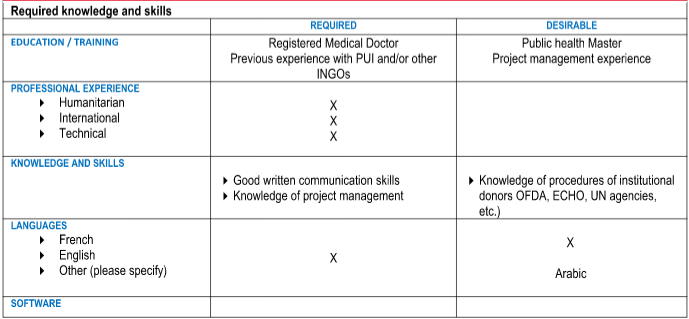 • Representation: She/he represents the mission to partners, authorities and local stakeholders involved in implementing medical programmes.