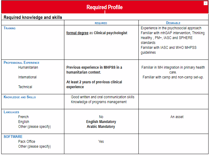 • Programmes: She/he will ensure implementation, oversight and monitoring of the activities related to MHPSS of the program in the frame of PUI response in East of Libya. She/he will develop PUI internal capacity on MHPSS by development of internal curriculums and human resources capacity building. S/he will be in charge of developing PUI MHPSS component, enlarging the scope of activities implemented. S/he will develop and/or reinforce the quality assurance process for MHPSS activities following national and international standards.