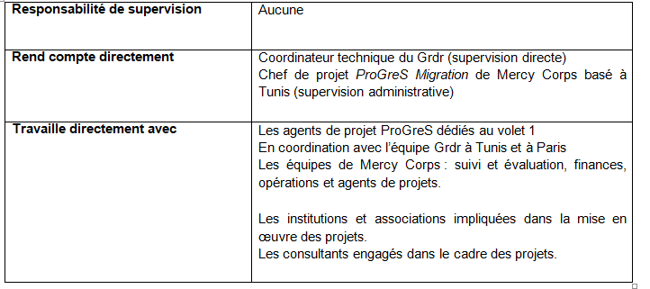 L’équipe ProGreS migration est composée d’une cellule de coordination basée à Tunis regroupant le chef de projet Mercy Corps et le coordinateur technique du Grdr. Ce recrutement concerne le volet 2 « gouvernance ».
