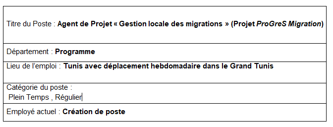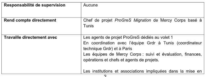 L’agent de projet travaillera sous la supervision directe du chef de projet ProGreS Migration basé à Tunis (Mercy Corps) et en étroite collaboration avec les agents de projet basés à Jendouba, Médenine et Kasserine. L’agent de projet collaborera également avec le coordinateur technique basé à Tunis (Grdr).