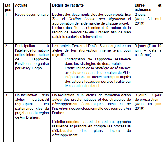 Le consultant qui sera retenu participera à des temps de travail avec l’équipe des deux projets pour avoir une bonne compréhension des approches adoptées par Mercy Corps, notamment l’approche résilience (cf étape 1) ;