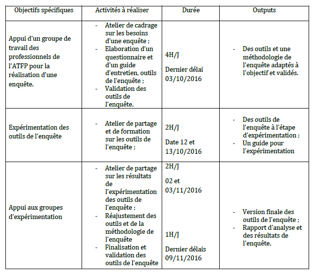 Dans la phase de lancement du projet, et dans le cadre du dit partenariat, L’ATFP et Mercy Corps veulent lancer une enquête autour de la valeur du travail chez les jeunes. Pour cette raison, un atelier a eu lieu, comme première étape d’un processus, les 21 et 22 Avril 2016 en engageant des professionnels d’appui représentants les différentes structures sous la tutelle de l’ATFP et de ces centres de formation pour la réaliser.