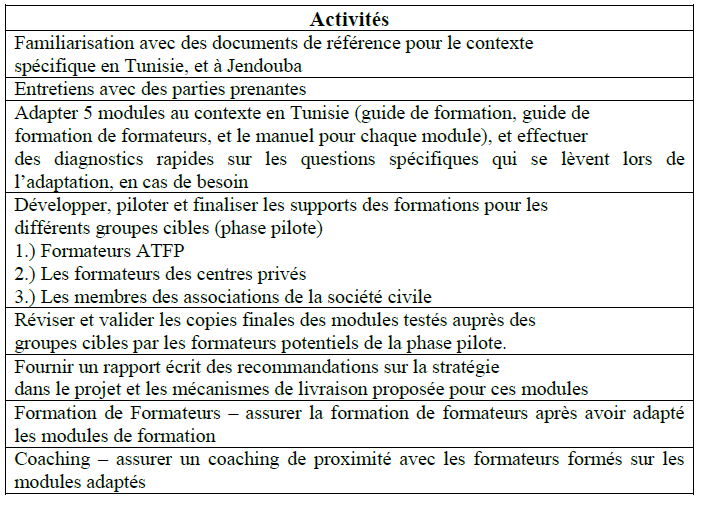 Ces modules seront enseignés par des formateurs de diverses institutions : formateurs ATFP/ jeunes formateurs de la société civile, formateurs au sein de centres de formation privé.