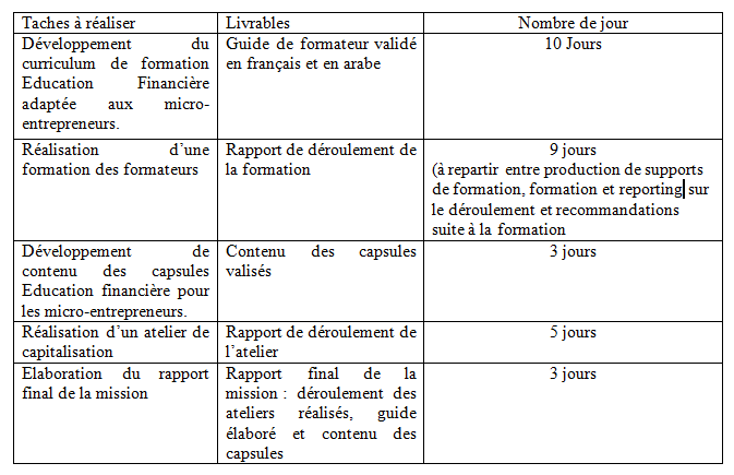 Sous la supervision du chef du projet et avec l’appui de la chargée Education financière,le/la consultant(e)assurera les tâches suivantes :