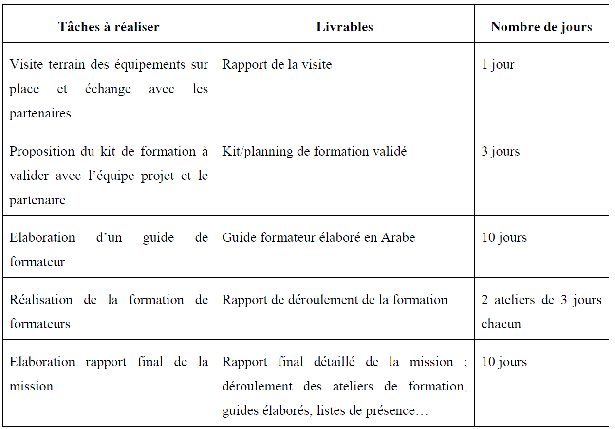 Le consultant organisera une formation de formateurs pour au moins 4 formateurs et au plus 8.