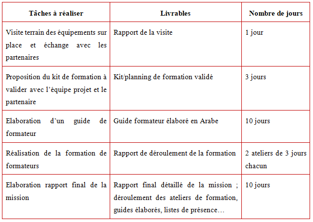 La mission démarre au plus tard le 15 Novembre 2018 et les livrables finaux doivent être soumis au plus tard le 31 Décembre 2018 y compris les périodes de validation.