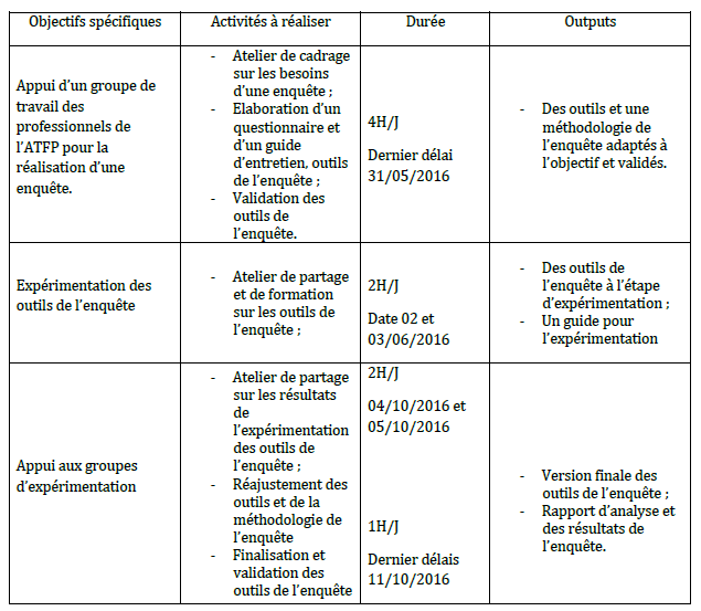 Objectif 2 : Appui d’un groupe de travail des professionnels de l’ATFP pour la réalisation d’une enquête à un niveau de généralisation.