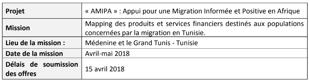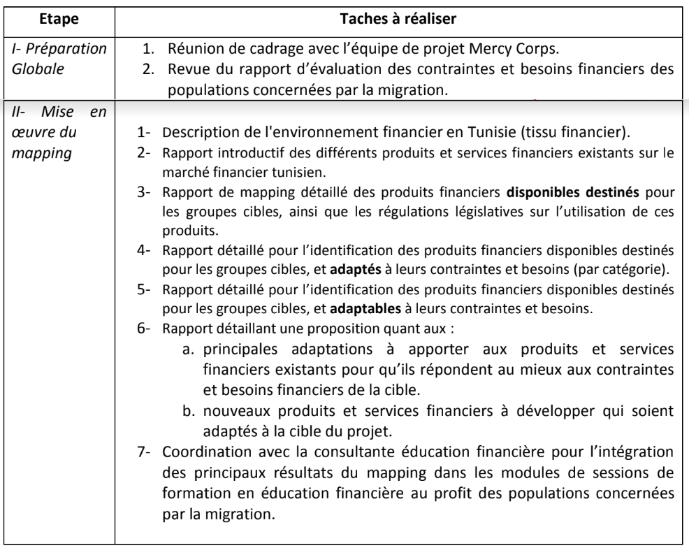 L’objectif de cette consultation consiste à produire un rapport retraçant les différents types de produits et services financiers existants sur le marché tunisien et ceux destinés à la cible du projet.