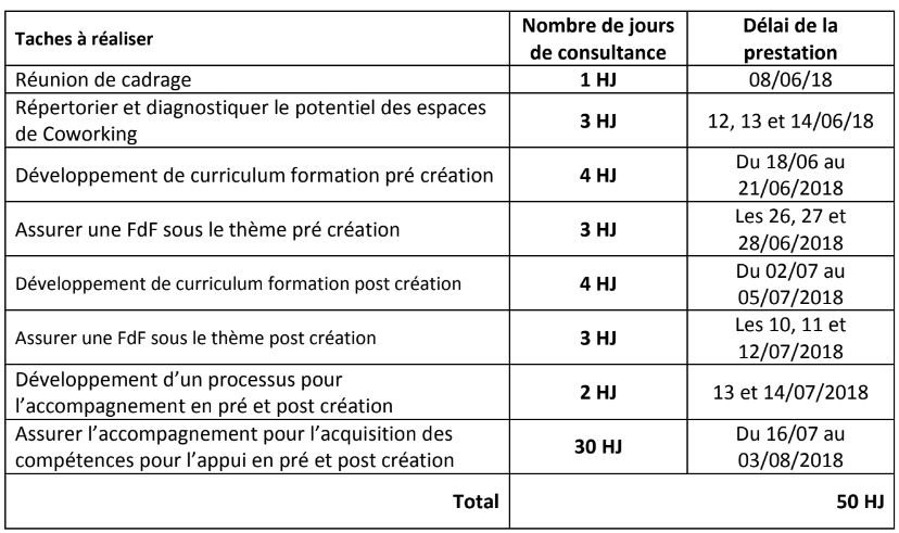 La durée totale de la mission est estimée à 50 jours de prestation détaillés dans le tableau suivant :