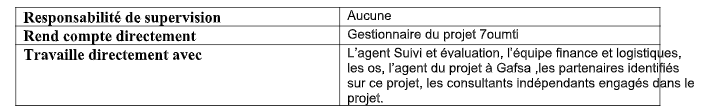 L’agent de projet « 7oumti » sera responsable de la mise en œuvre de toutes les activités à Sidi Hssine-Tunis. Il/elle travaillera en proximité avec l’équipe dirigeante et de support (incluant les finances, l’administration, et les projets) de Tunis et de Gafsa, afin s’assurer que la mise en œuvre quotidienne des activités soit bien réalisée en respect du calendrier, du plan d’action et du budget avec la qualité requise. Il/ elle assistera le Gestionnaire de Projet dans la délimitation du plan stratégique pour la mise en œuvre, en particulier les méthodes d’intervention pour une programmation efficace et une optimisation des résultats.