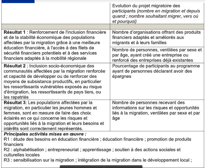- Les volets du projet : éducation et inclusion financière, alphabétisation, apprentissage professionnel, entrepreneuriat, migration et développement local