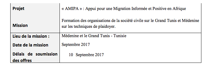 La mission s’insère dans le premier résultat de l’objectif spécifique 3 visant à appuyer les organisations de la société civile locale et de la diaspora dans les pays d’origine, de destination et de transit pour le développement de campagnes de plaidoyer, d’activités de sensibilisation et d’échanges de bonnes pratiques avec pour objectif de permettre aux populations concernées par la migration de réaliser des décisions de migration de manière informée en ayant conscience des risques et opportunités. Ces campagnes doivent permettre de renforcer les capacités des OSC locales et de la diaspora travaillant sur des thématiques liées à la migration, en techniques de plaidoyer afin de pouvoir bien mener des actions et compagnes de plaidoyer.