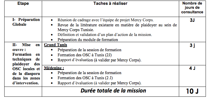 Mercy Corps recrute un consultant pour une formation des organisations de la société civile sur le Grand Tunis et Médenine sur les techniques de plaidoyer. عودة إلى الفرص
