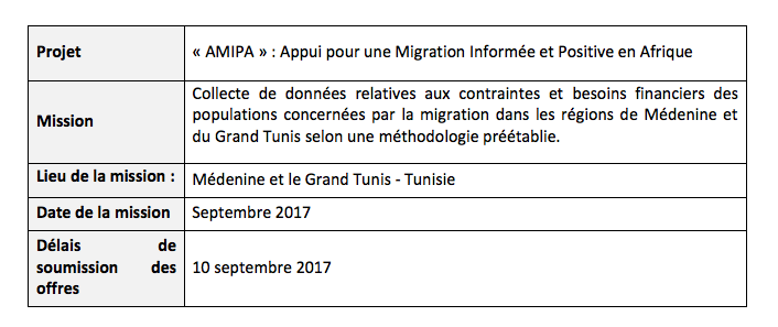 La collecte des données relatives aux besoins et contraintes spécifiques des populations concernées par la migration en Tunisie ainsi que la rédaction du rapport de l’évaluation se fera au travers d’une consultance nationale.