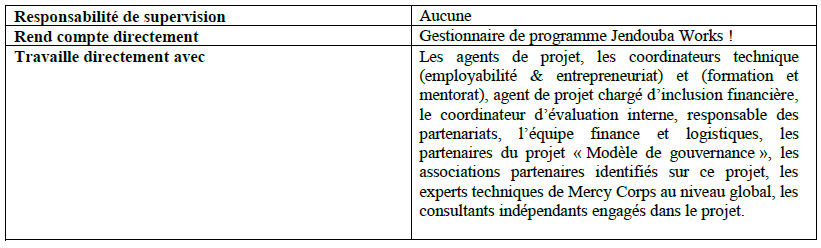 - Ce poste requiert des déplacements fréquents dans les zones d’intervention de Mercy Corps, notamment dans le nord-ouest de la Tunisie.
