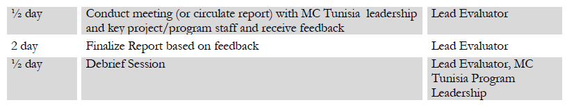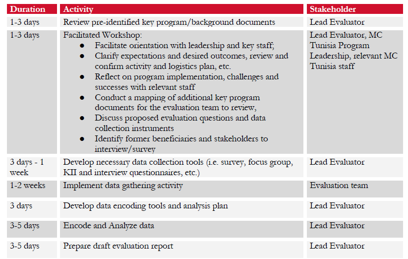 The evaluation will be led by an external Lead Evaluator who will be supported by Mercy Corps Tunisia program and M&E staff. The Lead Evaluator must have strong French language skills, as well as skills and experience designing and conducting focus groups, key informant interviews, and surveys for performance evaluations. While Mercy Corps Tunisia staff will help the Lead Evaluator by, for example, providing access to key program documents and existing M&E data, and facilitating access to beneficiaries, the Lead Evaluator will be responsible for designing and conducting the evaluation, and writing the evaluation report.