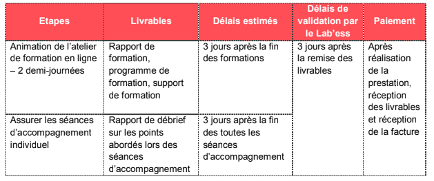 Le.la consultant.e s’engage à communiquer à l’équipe du Lab’ess le lien de connexion aux formations bien amont de la formation