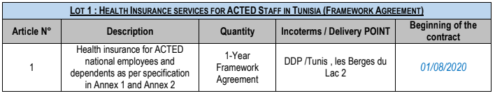 ACTED Tunisia / Libya implementing several of its projects funded by different donors across Tunisia, invites service providers to submit their offers for the signature of a one (1) year framework contract for the Health insurance for ACTED national employees and dependents as follows: