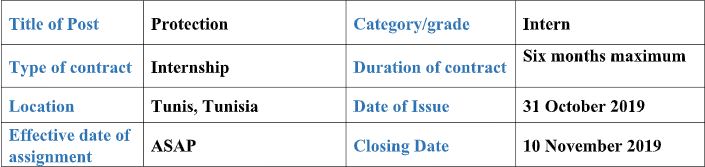 The intern will be based in the Country Office Tunis (Tunisia), she/he will be supervised directly by the Associate Community Based Protection Officer. In line with the overall protection strategy for the Tunisia operation, objectives for the incumbent will be guided and approved by the APO (CBP) CO Tunisia.