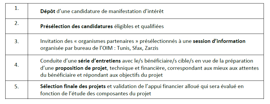Dans le cadre de l’évaluation des propositions de projets soumises par les « organismes partenaires » présélectionnés , l’OIM attribuera le financement des propositions sur la base de critères établis, en tenant compte, entre autres, de la faisabilité du projet, de l’effort d’appui pour l’accès à l’emploi et de l’intégration des Tunisiens et des migrants installés en Tunisie par le travail et la formation, du placement matérialisé des bénéficiaires cibles dans les projets, du cadre de soutien financier et/ou technique aux détenteurs de micro-projets, et de la pertinence par rapport aux objectifs énoncés dans l’appel à manifestation d’intérêt et des capacités de l’organisme partenaire.