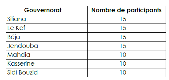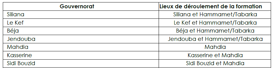 La session de formation sera prise en charge per le BIT pour les gouvernorats du Nord-Ouest et COSPE pour les gouvernorats de Mahdia, Kasserine et Sidi Bouzid.