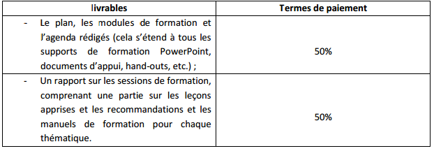 La durée de la consultation est 05 jours de travail. Le paiement des honoraires sera après la réception et la validation des produits attendus :