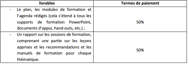 La durée de la consultation est 05 jours de travail. Le paiement des honoraires sera après la réception et la validation des produits attendus :