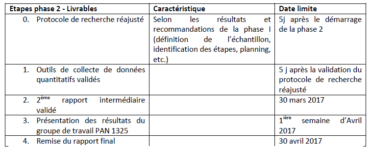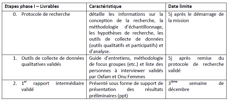 Durée : Dès la signature du contrat jusqu’au 31 décembre 2016 Méthodologie et étapes de réalisation : Pendant cette phase, l’équipe de recherche procédera à une recherche documentaire et à une première recherche qualitative sur un échantillon réduit.