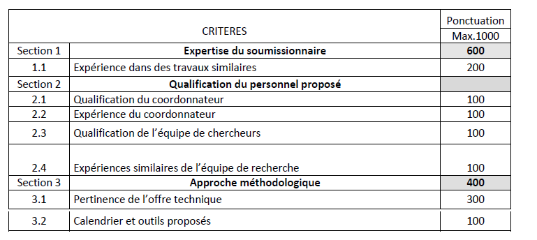 L’offre des Bureaux d’Etudes ou groupement de consultant/es / individuelle sera examinée selon la grille d’évaluation ci-dessous :