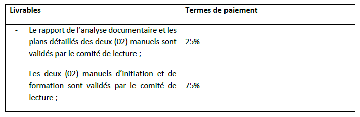 La durée de la consultation est de 13 jours de travail. Le paiement des honoraires se fera en deux (02) tranches comme suit :